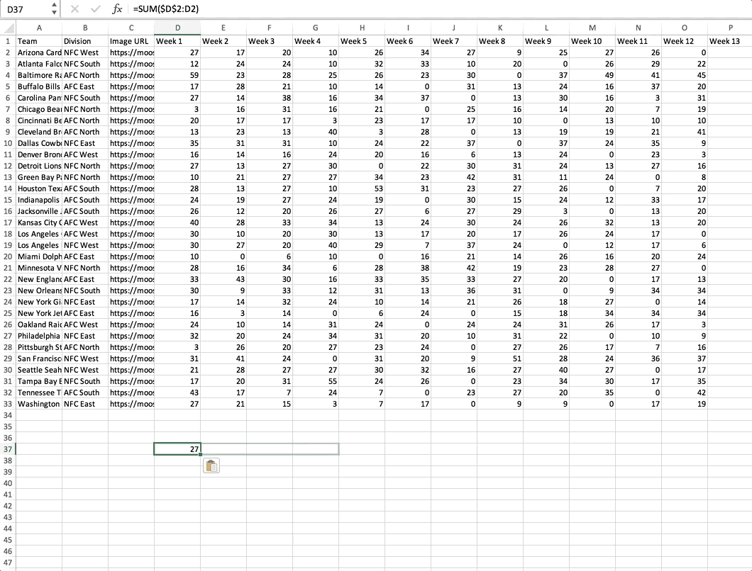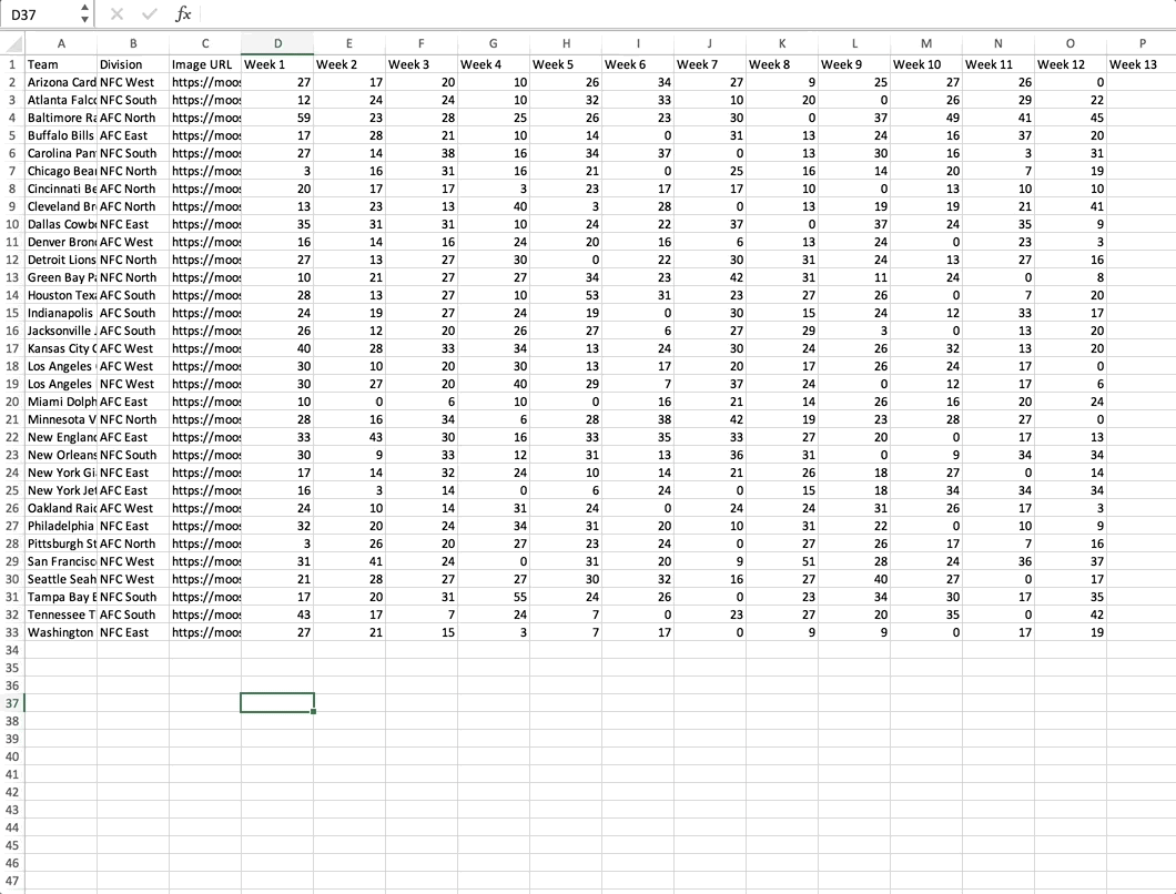 To get started, open your data in Excel or Google Sheets. We're using the data from the example above, which shows the points of football teams over 12 weeks.
