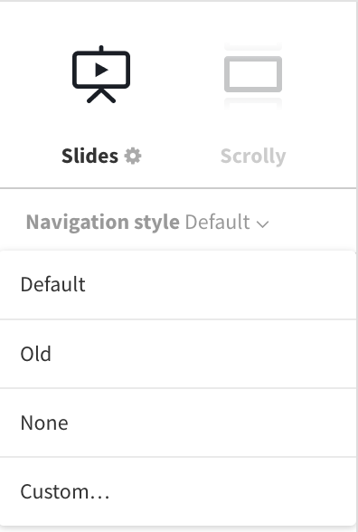 Flourish stories comes with three different, built-in styles for slide navigation: Default, Old and None. While everyone can choose between these using the Navigation menu in the story editor, customers with a Business account can also add custom styling, like custom fonts, colors and logos. To access this menu, click the cog wheel next to the Slides option.