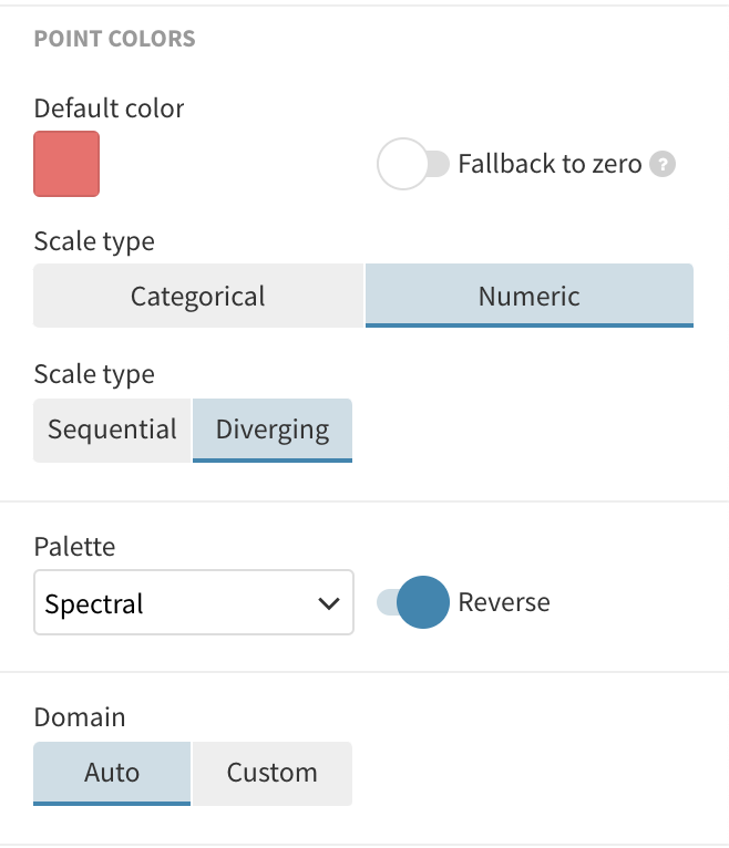 Choose a numeric color palette in the Colors settings. We chose a diverging color palette for our data. You can learn more about the differences between diverging and sequential color scales in our help doc.