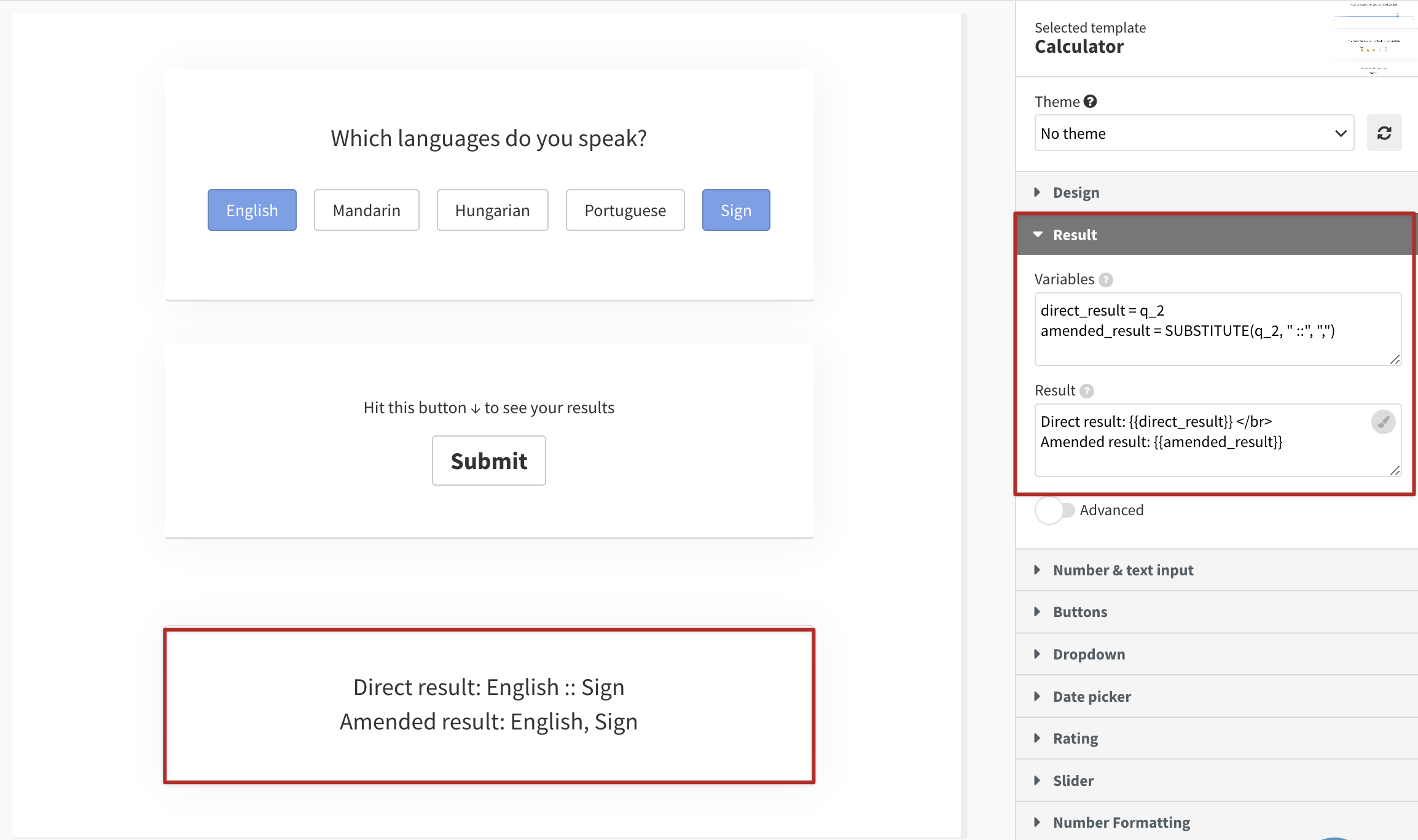 - In the Result section of the settings panel, define variables and formulas in order to calculate the results. You can then compose the results with (or without) any variables. Variable values can be: