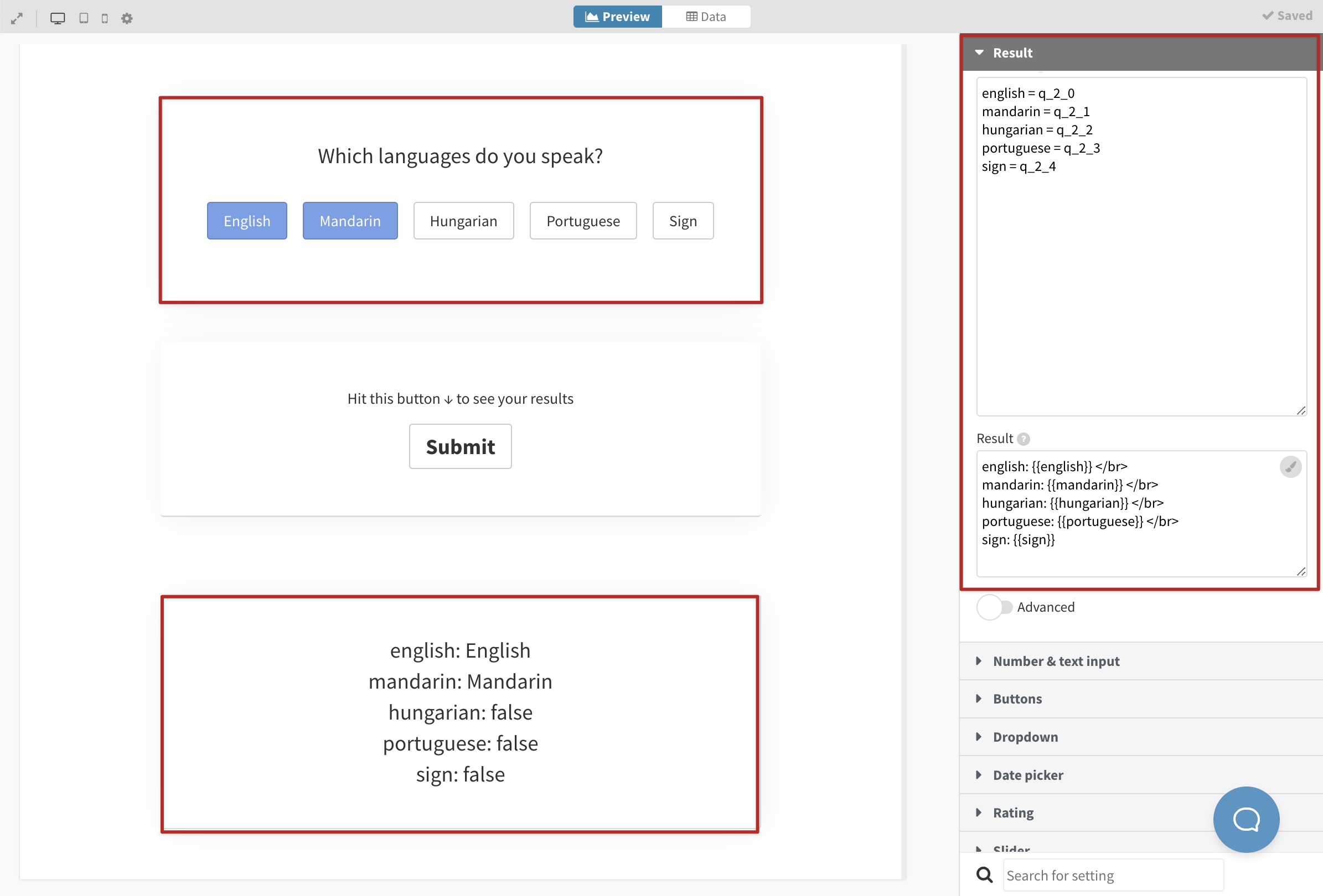 The final result view can be composed in the Results field with any previously defined variable or any question variable (starting with