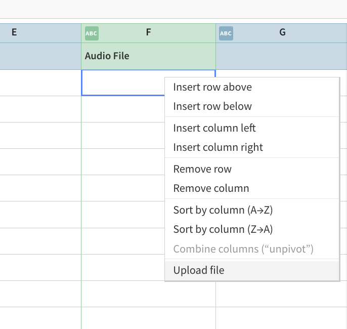 In the data tab, create a new column for your audio files and upload your audio files in an MP3 format by right-clicking in the cell and selecting "Upload file"