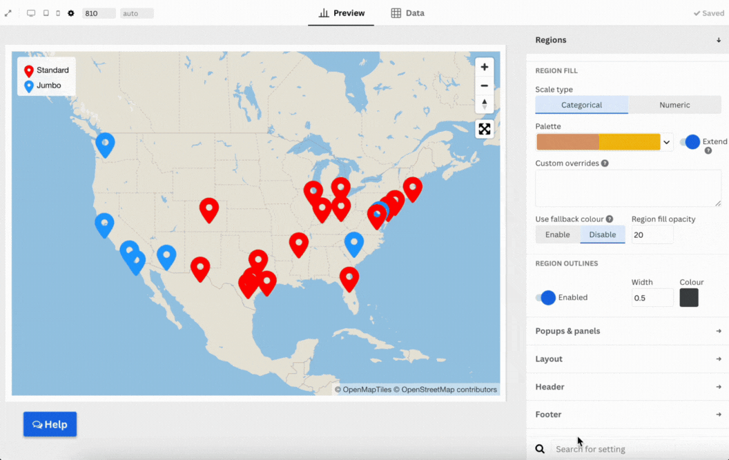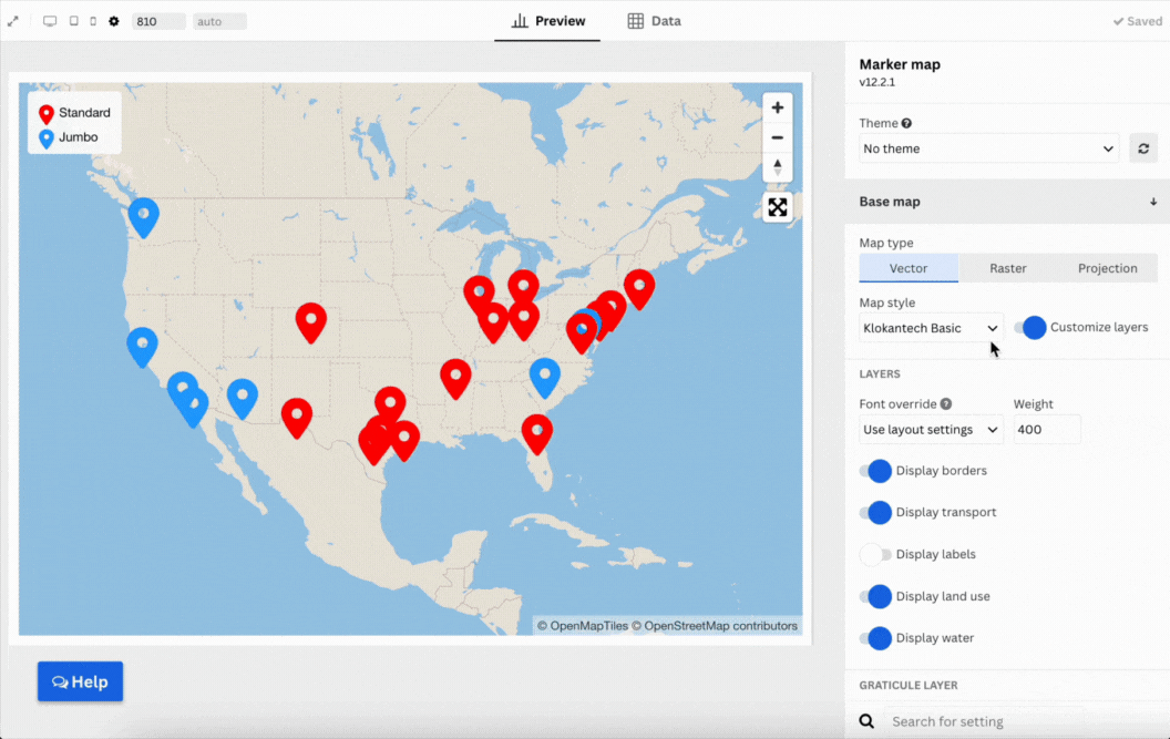 If you're using a vector base map, you can turn layers like labels, streets and buildings on or off. This is useful if your map feels crowded and you’d like the regions or your markers to stand out.