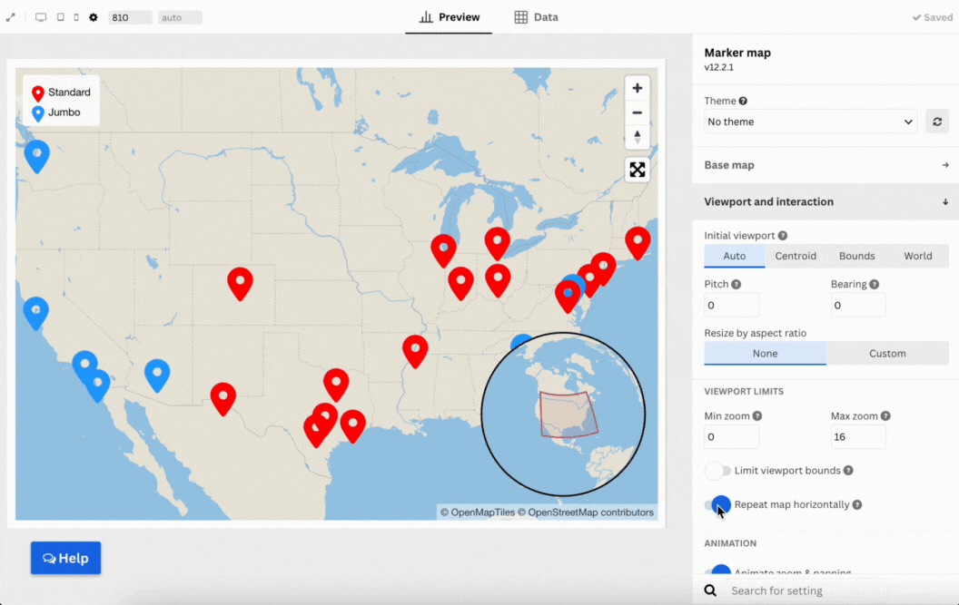 Define the initial zoom and position of the map. Use the auto setting, or set a specific area with centroid or bounds.
