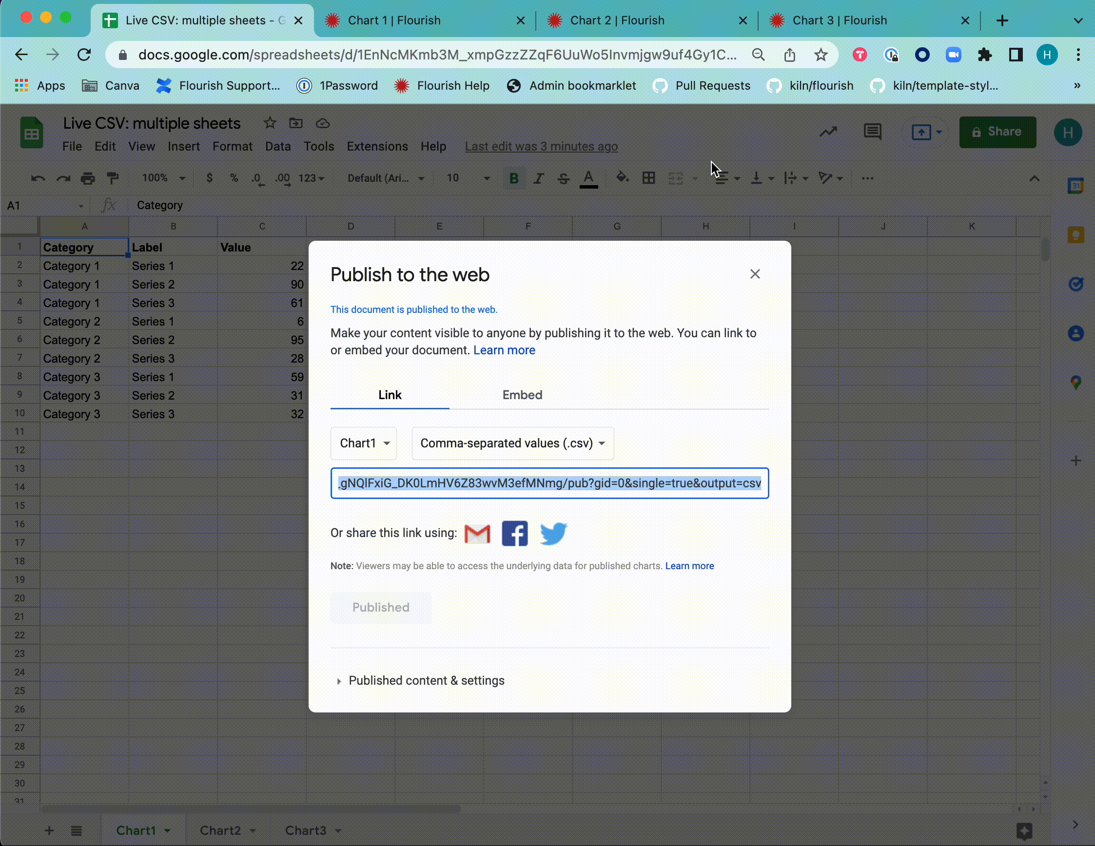 Copy the URL and back in your Flourish visualization, select Import from URL from the data upload button and paste the URL here.