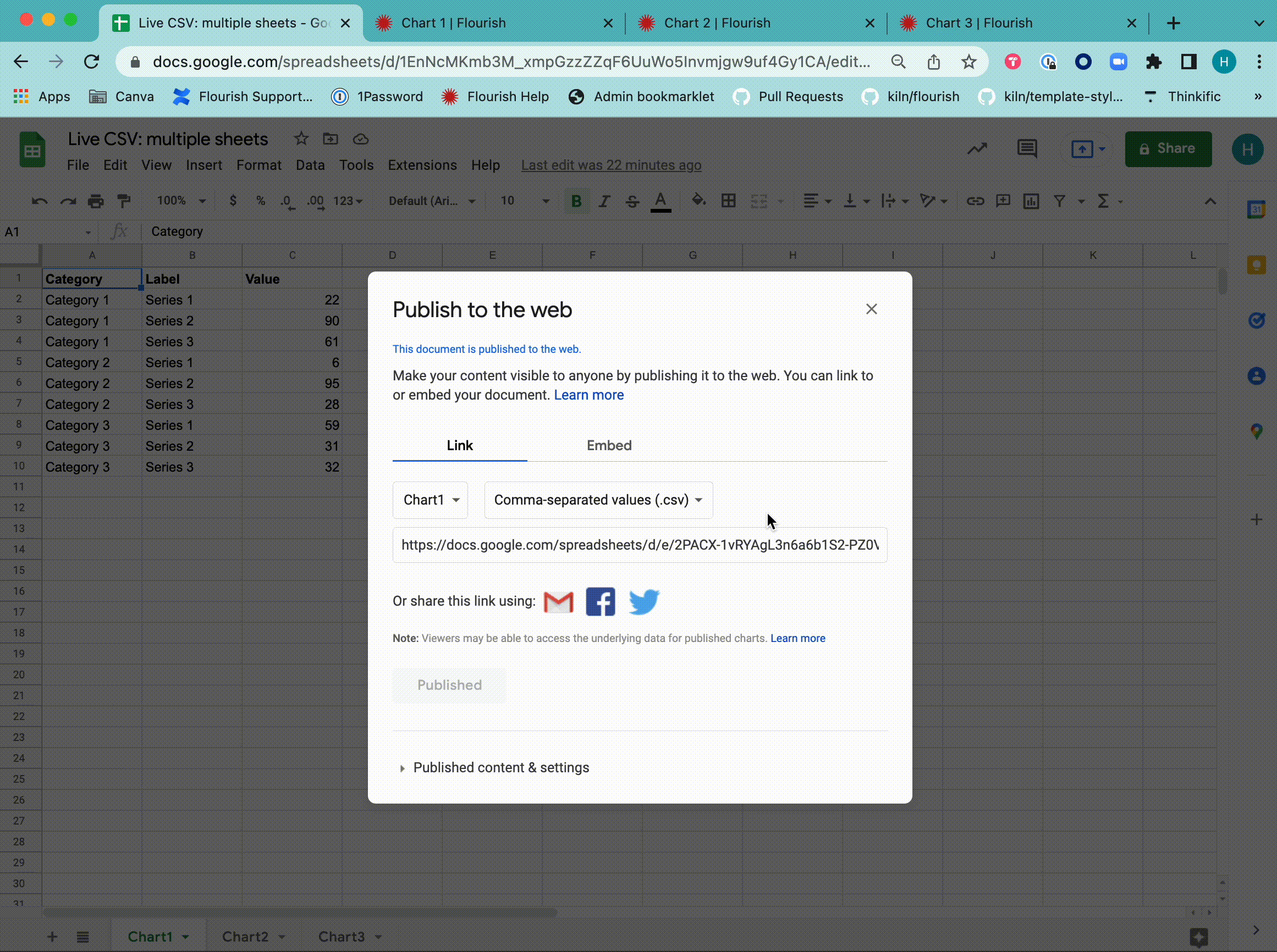 NOTE: Even if you want to publish the entire sheet eventually, you need to select and publish the sheets one by one in order to retrieve separate URLs for each.