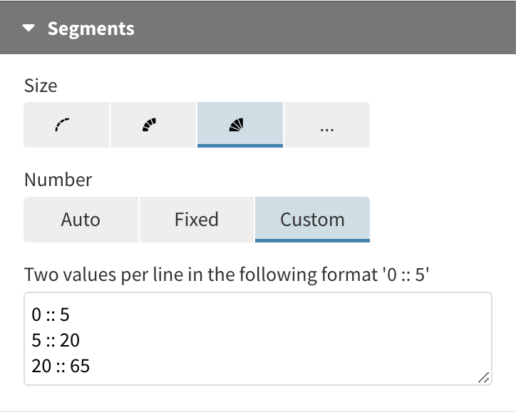 - The number of segments, choosing between Auto (an automatically assigned number of segments), Fixed (a fixed number of segments of equal widths) or Custom (a custom number of segments with custom-defined widths). When selecting Custom, you can supply your segments in the following format: