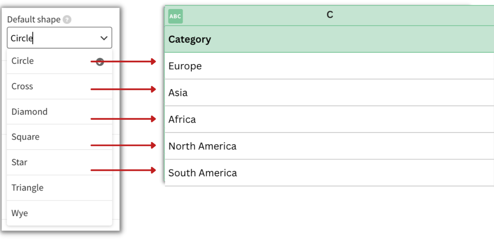 If you would like to change the order of your shapes, you can do that by swapping the order of the categories within the Data tab. Therefore, if we swap Europe with Asia in the example below, the shapes will swap, too.