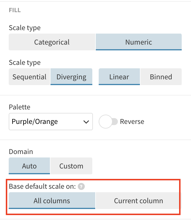 By default, Flourish will use the same scale across all columns. This means that they will all be colored by the same min and max in your legend. This is useful if you would like to be able to compare the different columns of data.