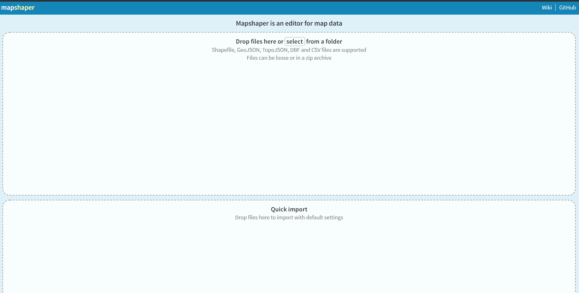 Head over to mapshaper.org and import your data. They can either be loose files or a ZIP file. In this case, our ZIP file contains multiple shapefiles, so we opted for the former. You are able to upload only the .shp file or all of the additional ones for more information.