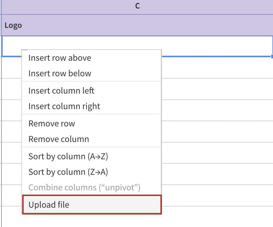 If you don't already have a URL for an image because, for example, the image is saved to your computer, you can always right-click on a cell of the Image column in the Data tab and choose Upload file. This will let you browse through your local files and upload the appropriate image to the Flourish server.