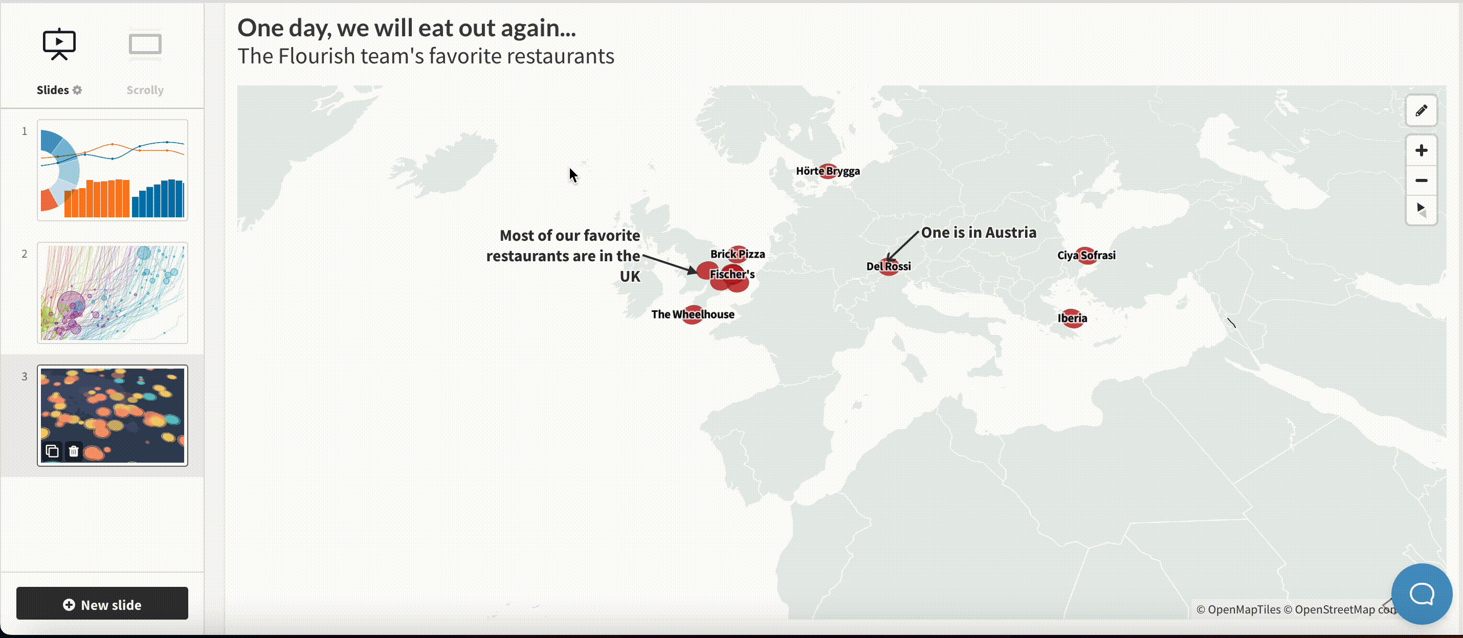 Inside the story editor, you'll find a pen icon in the right corner of the visualization. Use this to drop in annotations. Simply click where you'd like to add annotation. Wherever you click, an annotation will be added.